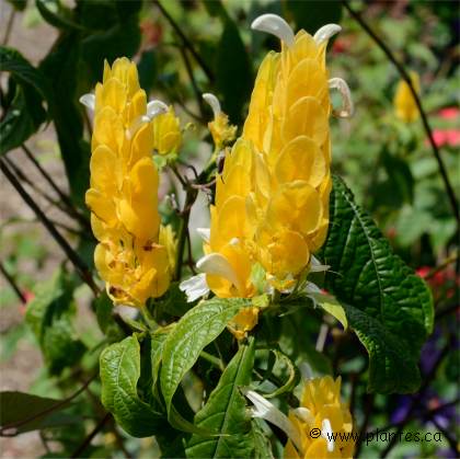 lutea Panache d'officier Le panache d'officier, ou pachystachys jaune est un petit arbuste buissonnant au port arrondi. Il aime le plein soleil et un sol frais et riche. Le feuillage persistant est fait de longues feuilles lancéolées vertes foncés aux nervures prononcées. On en fait la culture en appartement pour les bractées de couleur jaune vif qui poussent au bout des tiges, et durent quelques mois. La floraison d'été, de courte durée, produit des fleurs blanches, ou crème, qui s'ouvrent dans les bractées. Jusqu'à 120 cm de haut et 65 cm d'espacement. |