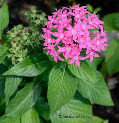 Pentas lanceolata Pentas carnea Bouquet d'étoiles Le bouquet d'étoiles est un petit arbuste érigé arrondi des régions tropicales qui aime un plein ensoleillement, ou la mi-ombre, dans un sol frais bien drainé. Il est cultivé pour son feuillage fait de feuilles lancéolées vert éclatant souvent pubescentes et les inflorescences de fleurs en forme d'étoile qui poussent à la cyme des branches. La floraison, du printemps à l'été, produit des fleurs de couleur roses, rouges, blanches ou pourpres selon le cultivar, qui poussent en grappes. Bonne plante pour l'intérieur, cultivée en pot ou en paniers suspendus. Il faut bon arrosage en période de croissance et tailler les fleurs fanées pour prolonger la floraison. Jusqu'à un mètre de hauteur et d'étalement. |